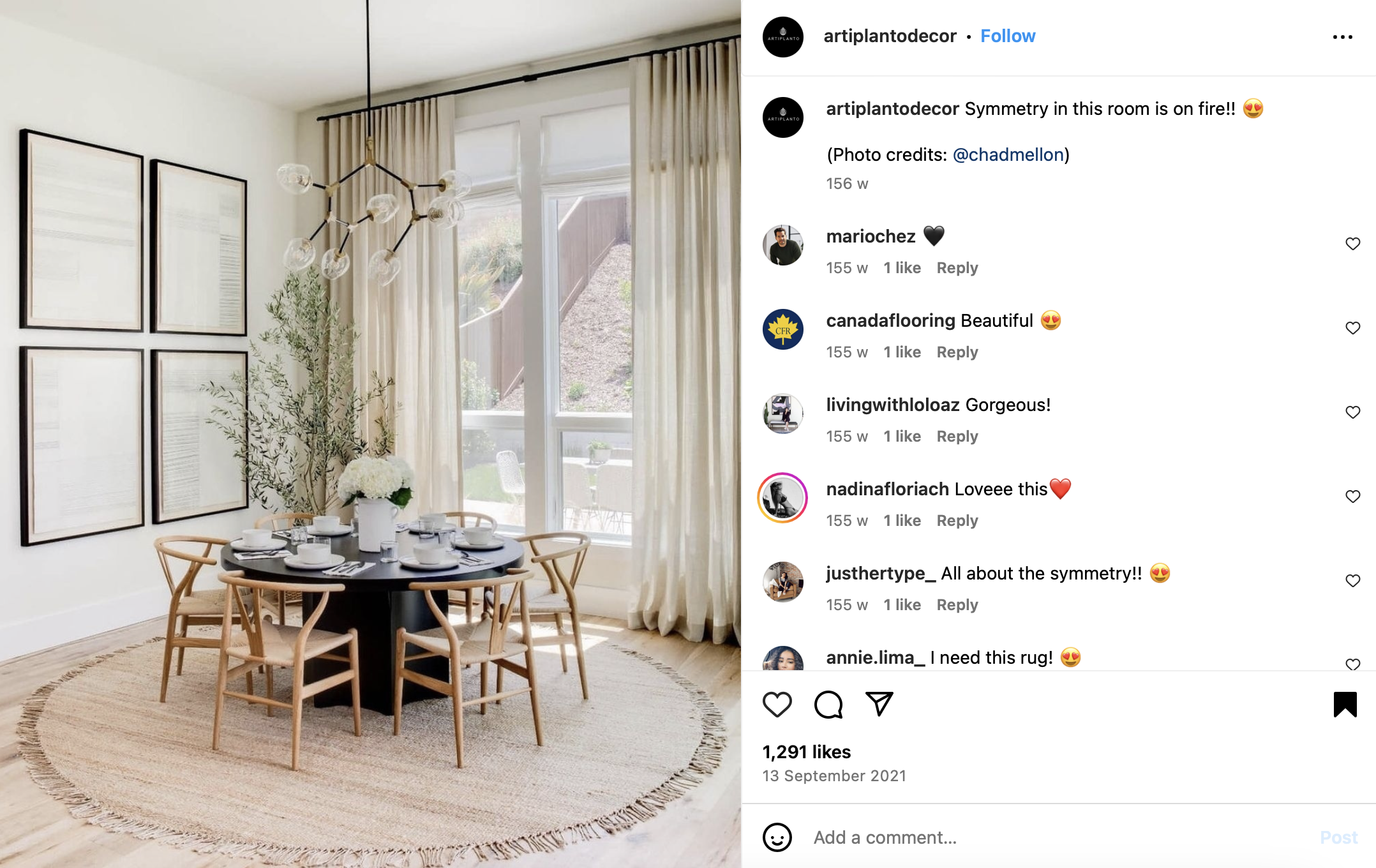 Naturally, I went to Instagram and Pinterest for inspiration. I eventually settled on this one because the position was very similar to mine and I believed I could make this work. We have a really large living room with expansive white walls so I loved the idea of adding artwork as a backdrop but thought four large frames would be overkill so I settled for two. While a carpet is always lovely, I cannot understand the concept of having one under a dining table which comes with a high risk of spills.