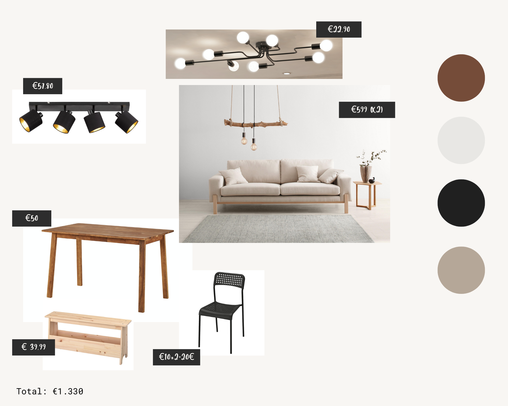 I built the Mood Board in Canva. The individual images for the furniture are taken from the respective websites. Since the light fixtures are common for the room, they are not included in the cost breakdown.